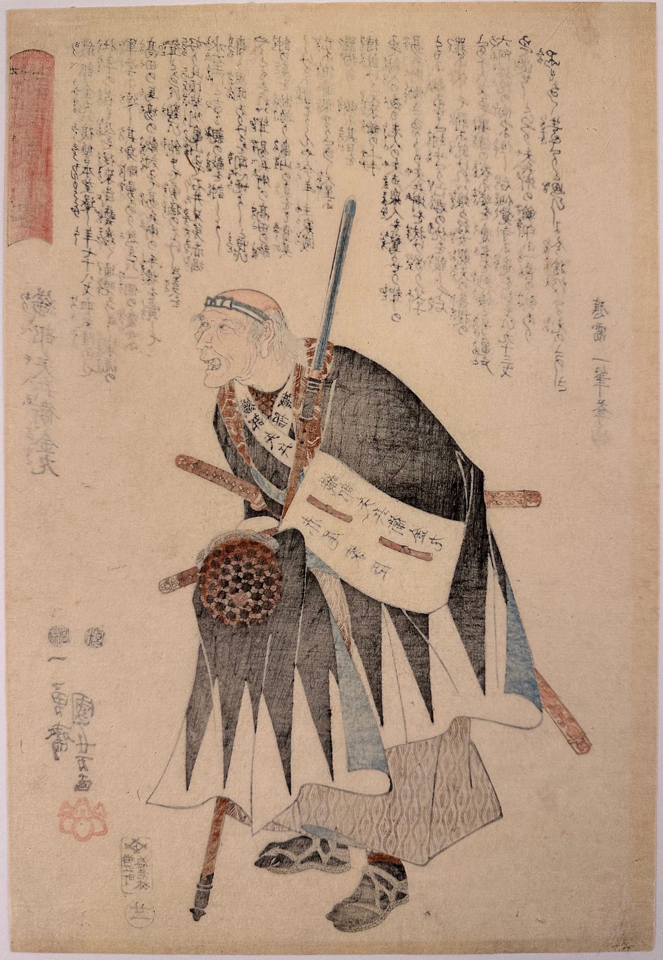 Subject: The ronin Oribe Yahei Kanamaru (kabuki name) – the old man bent over holding his helmet and his preferred weapon, the yari