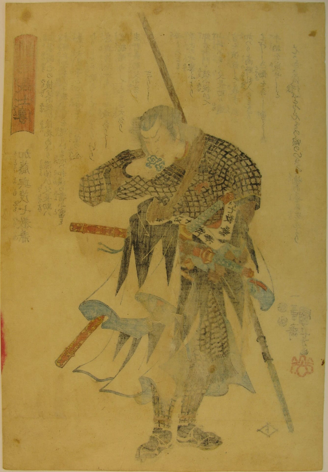 Subject: The ronin Yato Yomoshichi Norikane (Kabuki name) – holding his spear drinking from a decorated porcelain cup