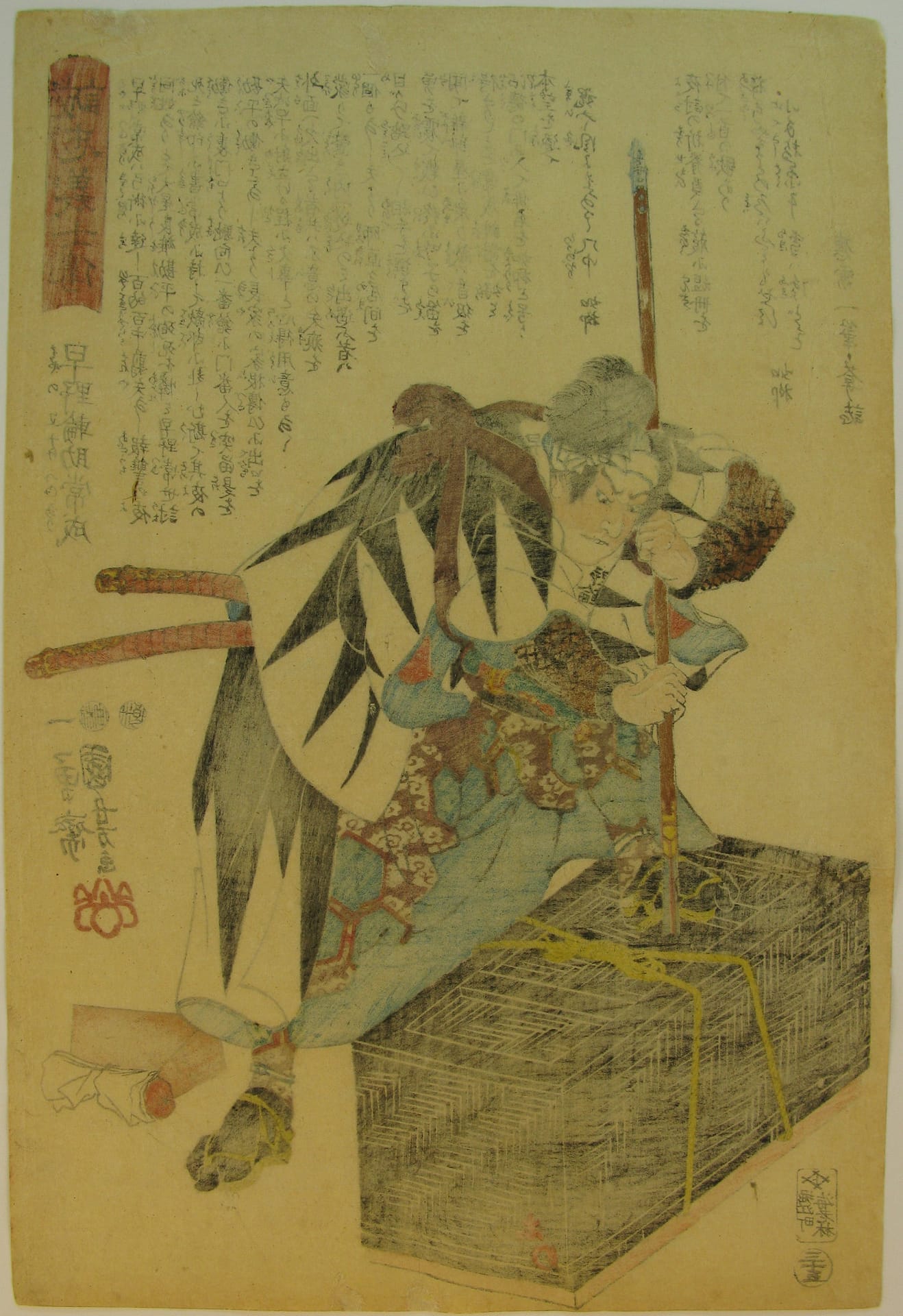 Subject: The ronin Hayano Wasuke Tsunenari (kabuki name) – piercing a cord bound wicker chest in his serach for Moronao