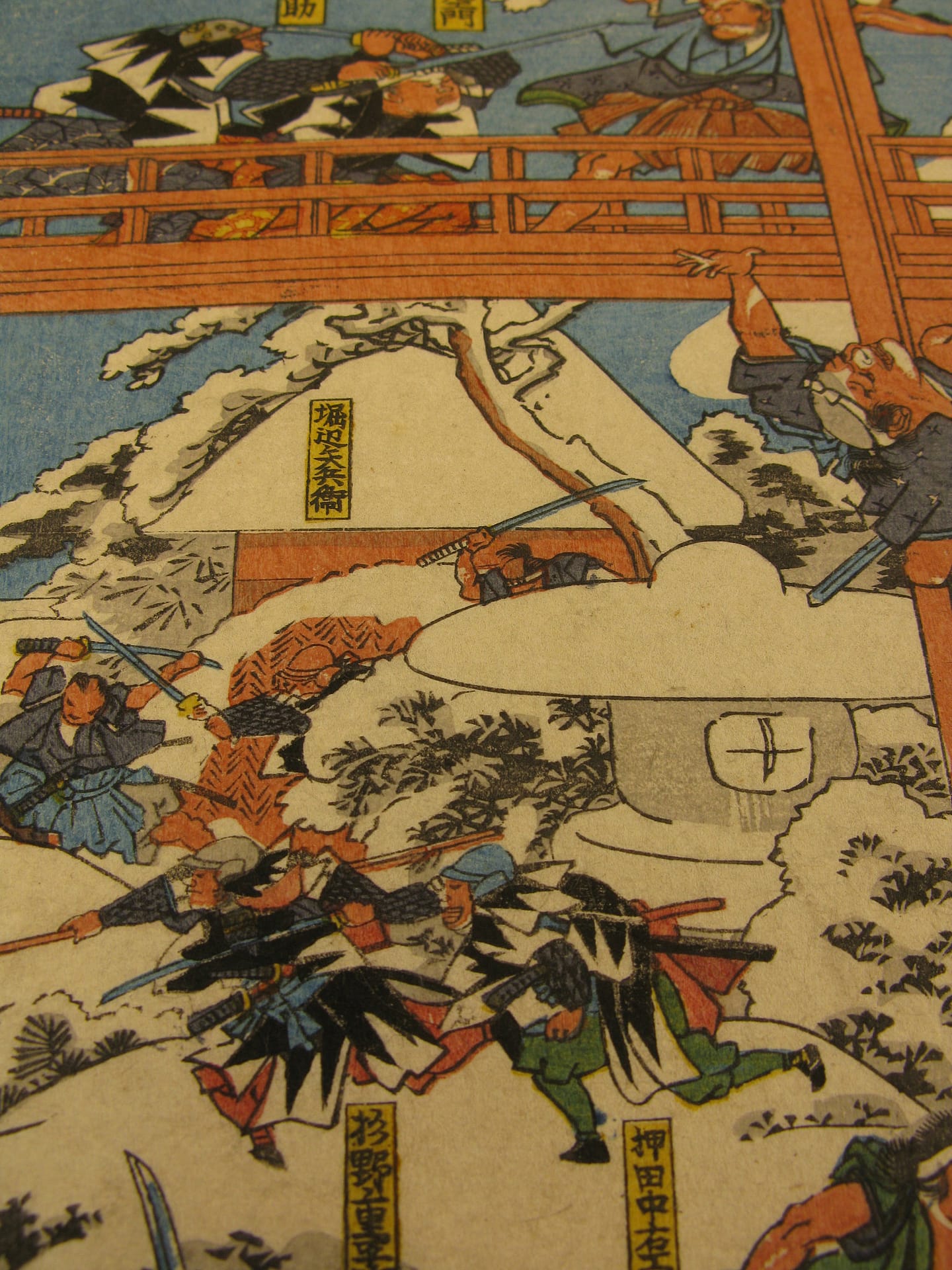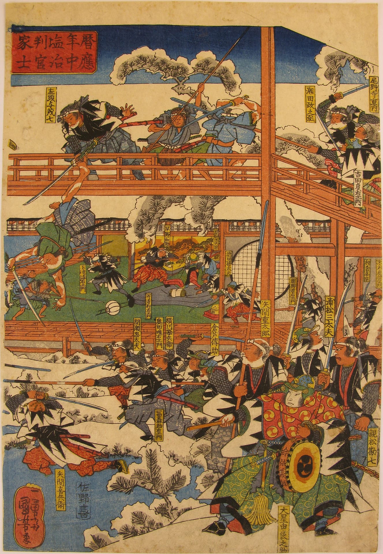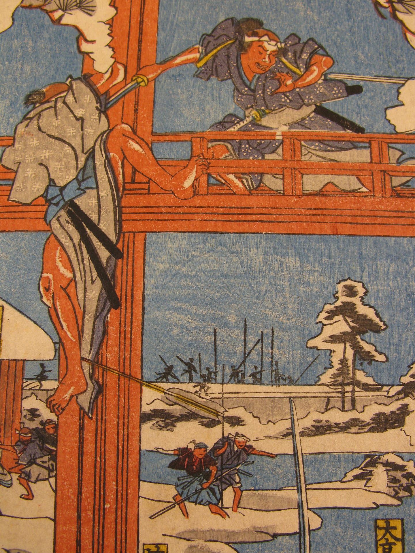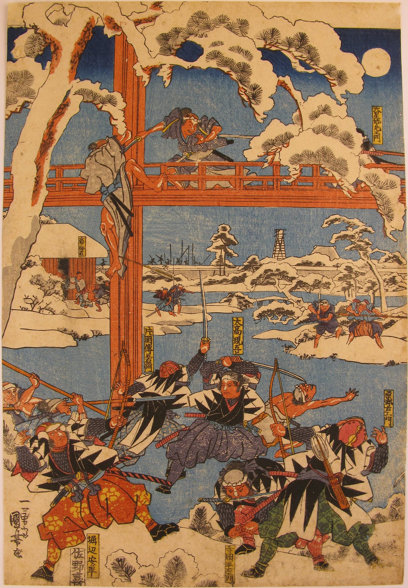 Description: The forty seven ronin fight furiously with Moronao’s retainers along the lake shoreline and across a gallery walkway that spans the lake and inner garden of Moronao’s residence. All overseen by Oboshi Yuranosuke (bottom right) seated on his camp stool and beating his war drum
