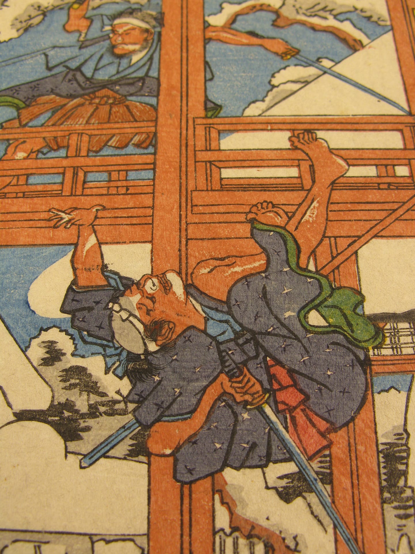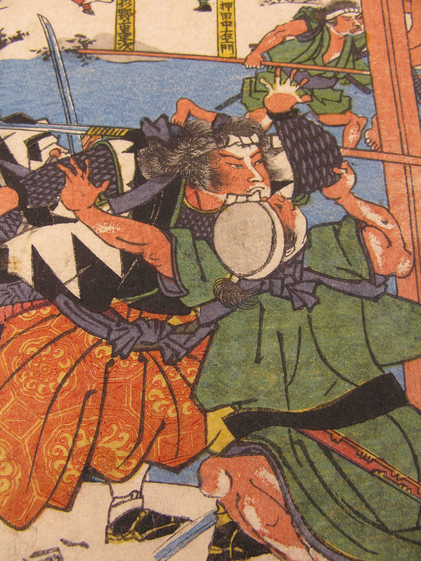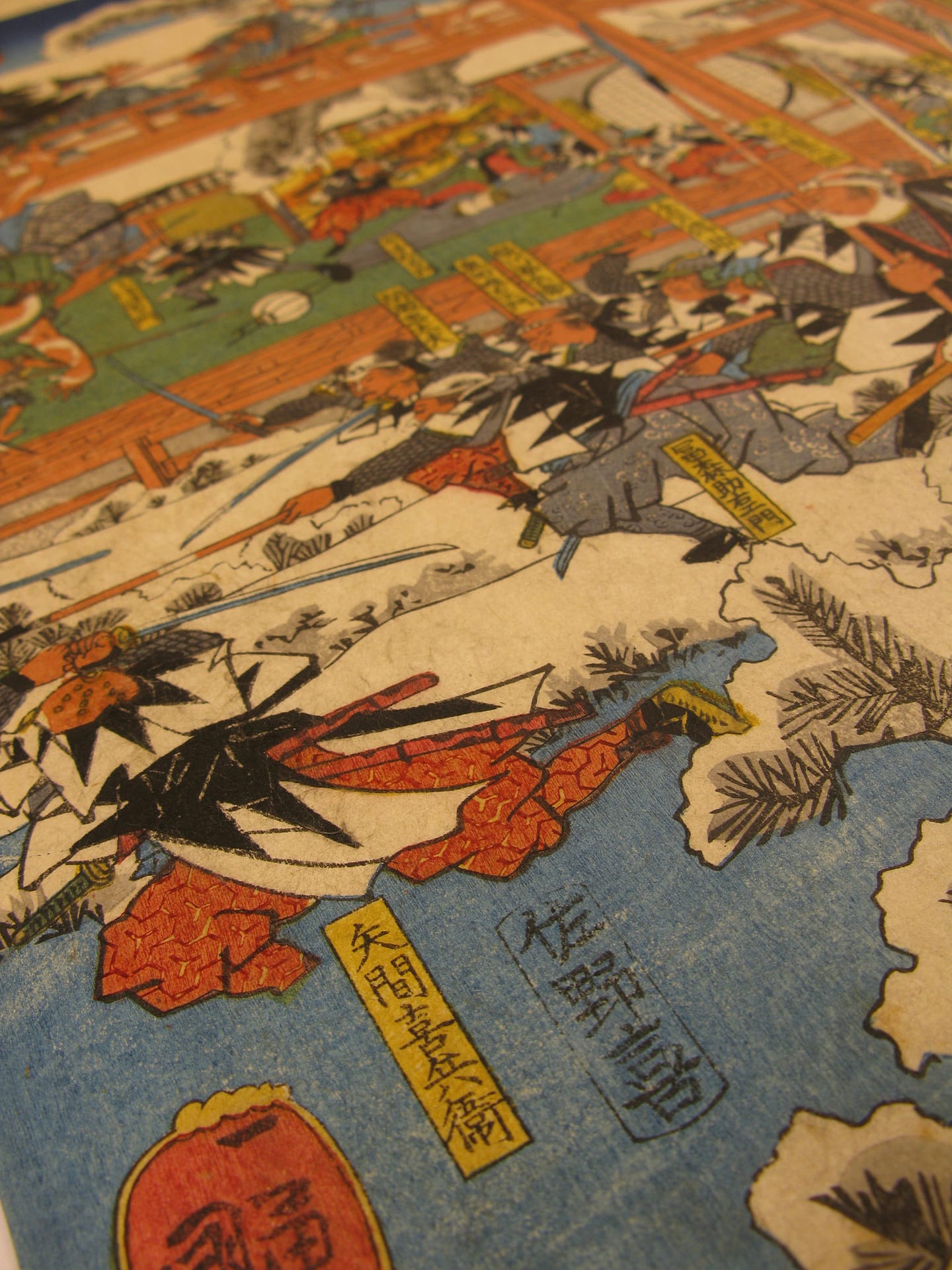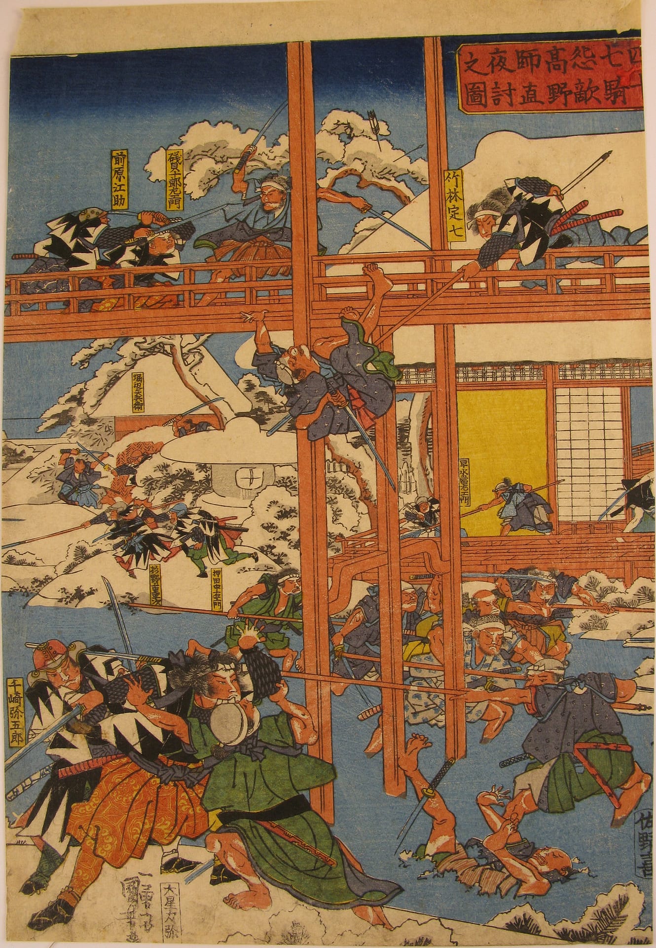 Description: The forty seven ronin fight furiously with Moronao’s retainers along the lake shoreline and across a gallery walkway that spans the lake and inner garden of Moronao’s residence. All overseen by Oboshi Yuranosuke (bottom right) seated on his camp stool and beating his war drum