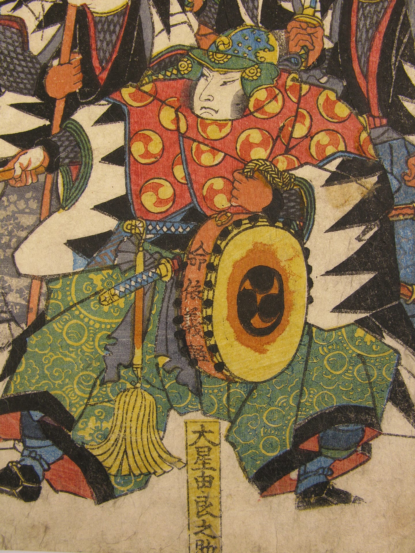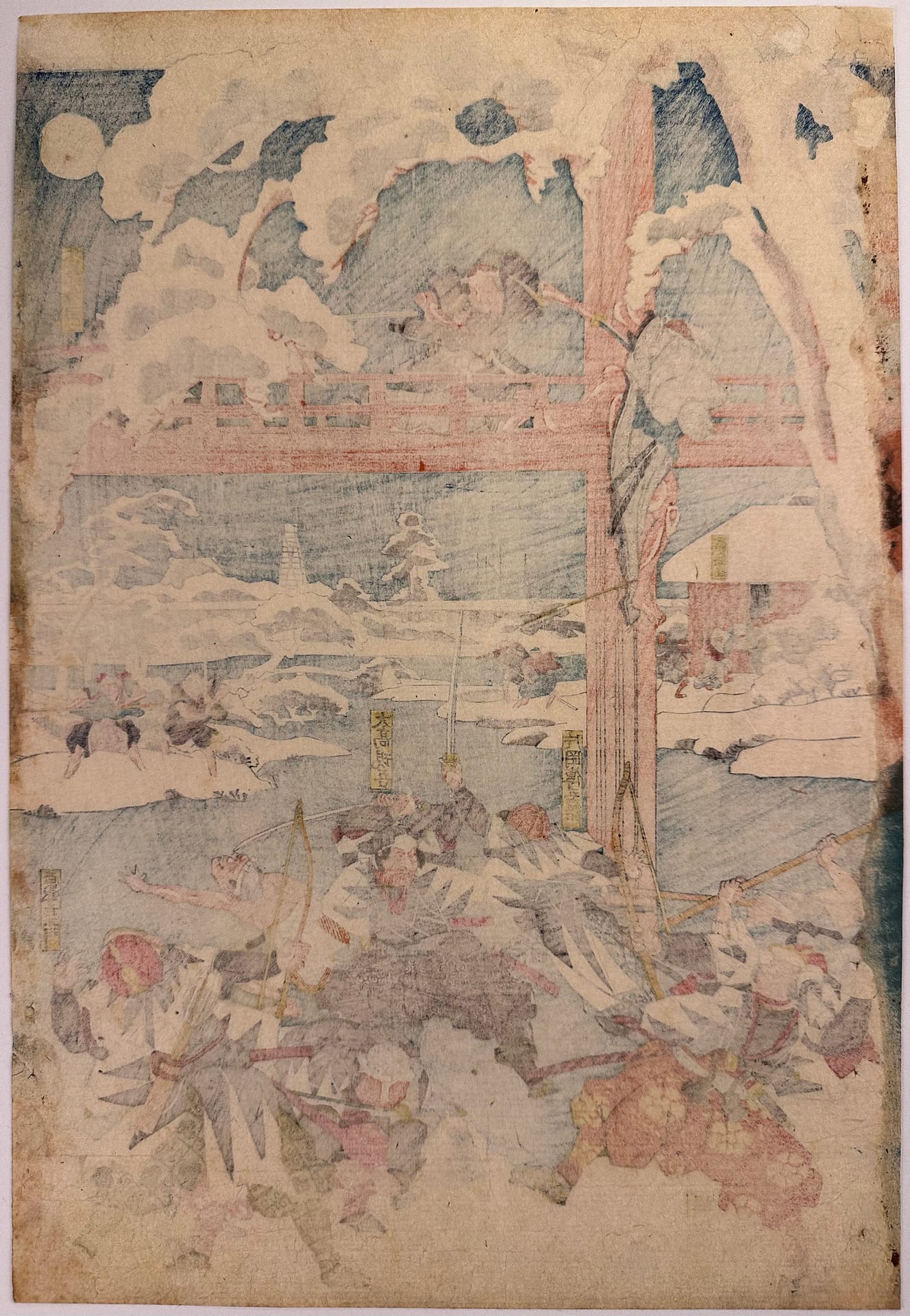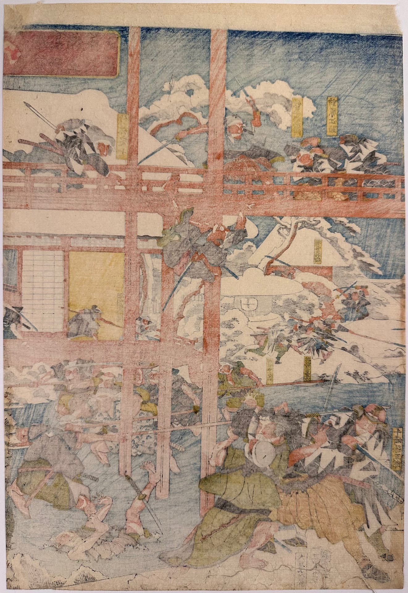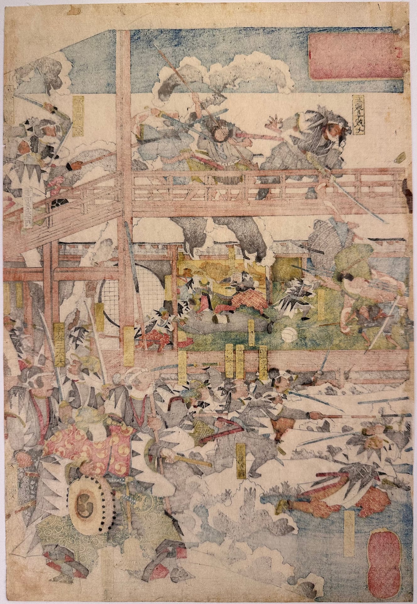 Description: The forty seven ronin fight furiously with Moronao’s retainers along the lake shoreline and across a gallery walkway that spans the lake and inner garden of Moronao’s residence. All overseen by Oboshi Yuranosuke (bottom right) seated on his camp stool and beating his war drum