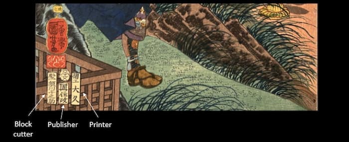 Block cutter and/or Printer name: These can be found on some prints either alone or in combination. Generally display in a cartouche alongside the Publisher’s seal.